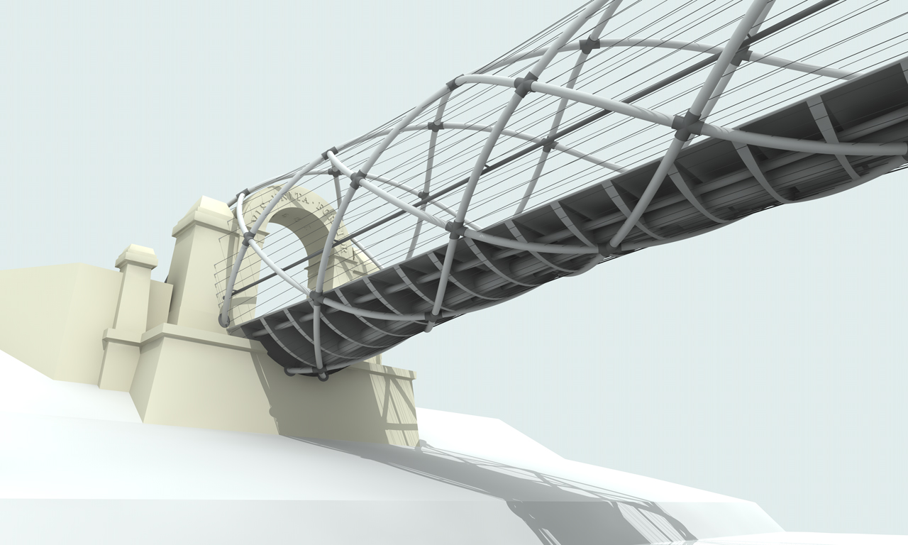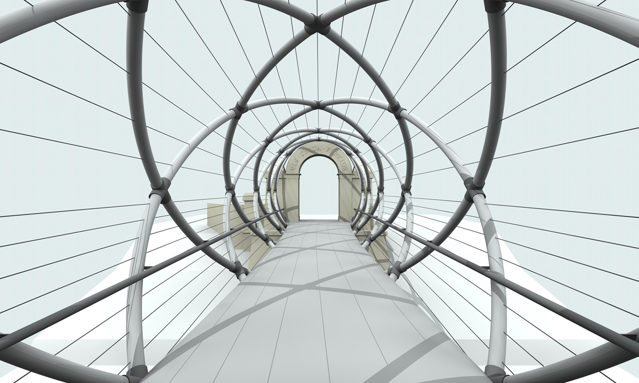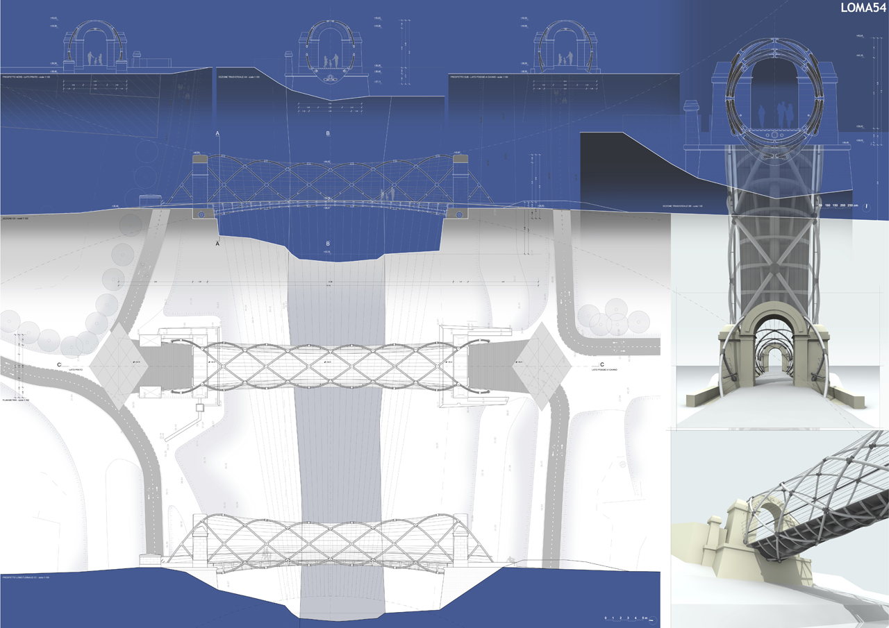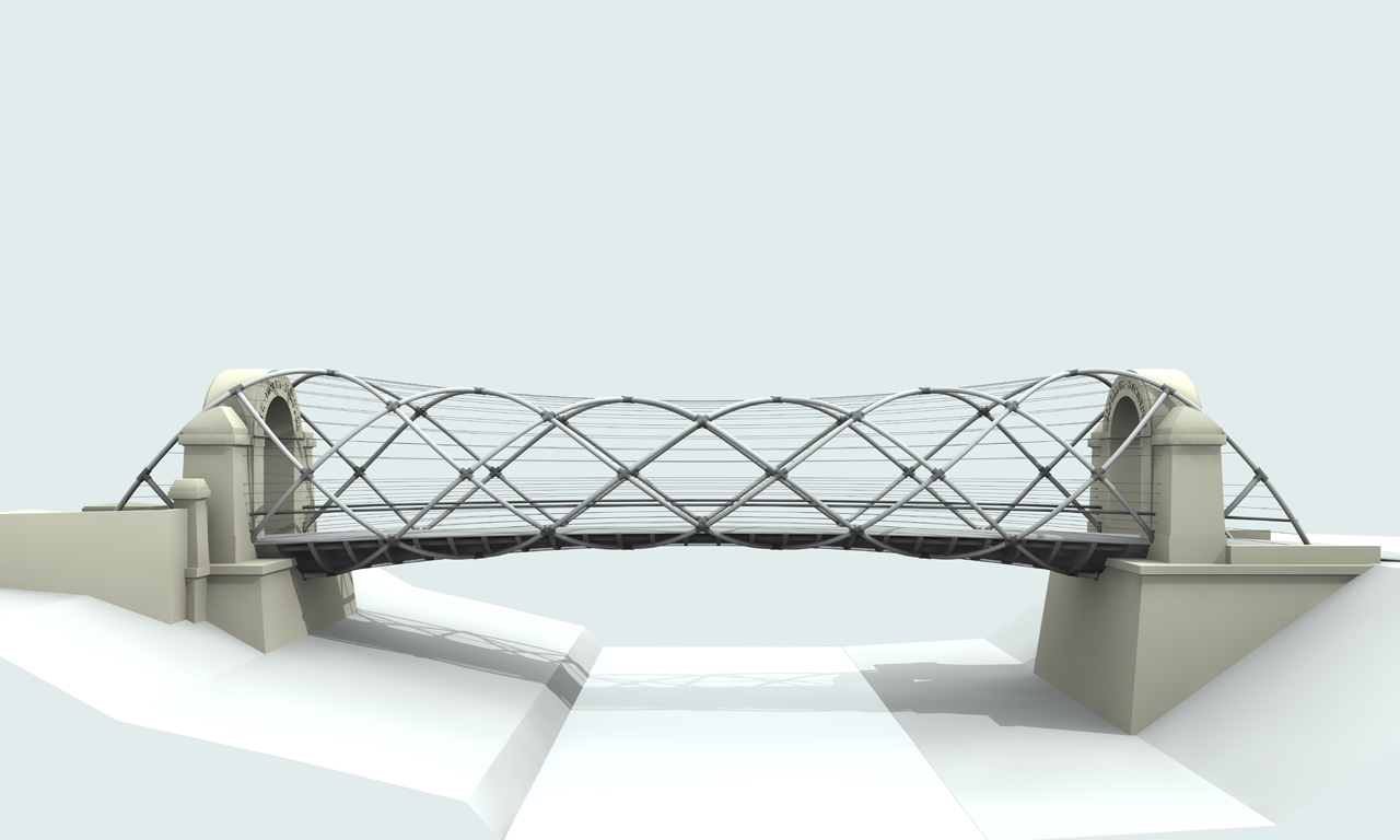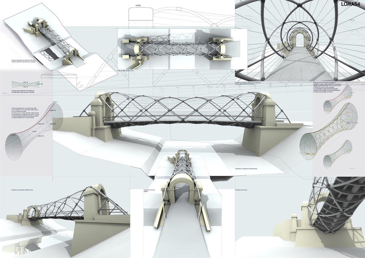 La proposta progettuale per il ponte pedonale che presiede il luogo delle Cascine di Tavola prevede una struttura metallica in elementi tubolari e tiranti in cavi di acciaio che corrono lungo la superficie di inviluppo definiscono porzioni di spazio aperto, piccole e grandi aperture come “finestre” che inquadrano e valorizzano un punto di vista particolare del paesaggio circostante. L’intreccio delle linee conferisce fisicità all’idea dei filari che si avvolgono su se stessi attorno ad un nucleo centrale che, nel nostro caso, è definito da una superficie teorica generata a partire da ellissi e cerchi ed archi tracciati come parti di circonferenze. l’atto del camminare attraverso il ponte non è la sola funzione dell’attraversamento ma anche il sentirsi parte di un contesto nuovo volto alla valorizzazione del paesaggio circostante. Le eliche che circondano il tutto sono geometrie senza inizio e senza fine, moduli periodici replicabili all’infinito, rendono a pieno l’idea di continuità e allo stesso tempo definiscono con estrema chiarezza l’idea di evoluzione, la stessa evoluzione che si prova quando si attraversa, quando si varca una soglia, quando si lascia uno spazio per approdare in uno nuovo. L’idea del ponte è essenzialmente questa: collegare due realtà, definirne il passaggio e allo stesso tempo il confine.