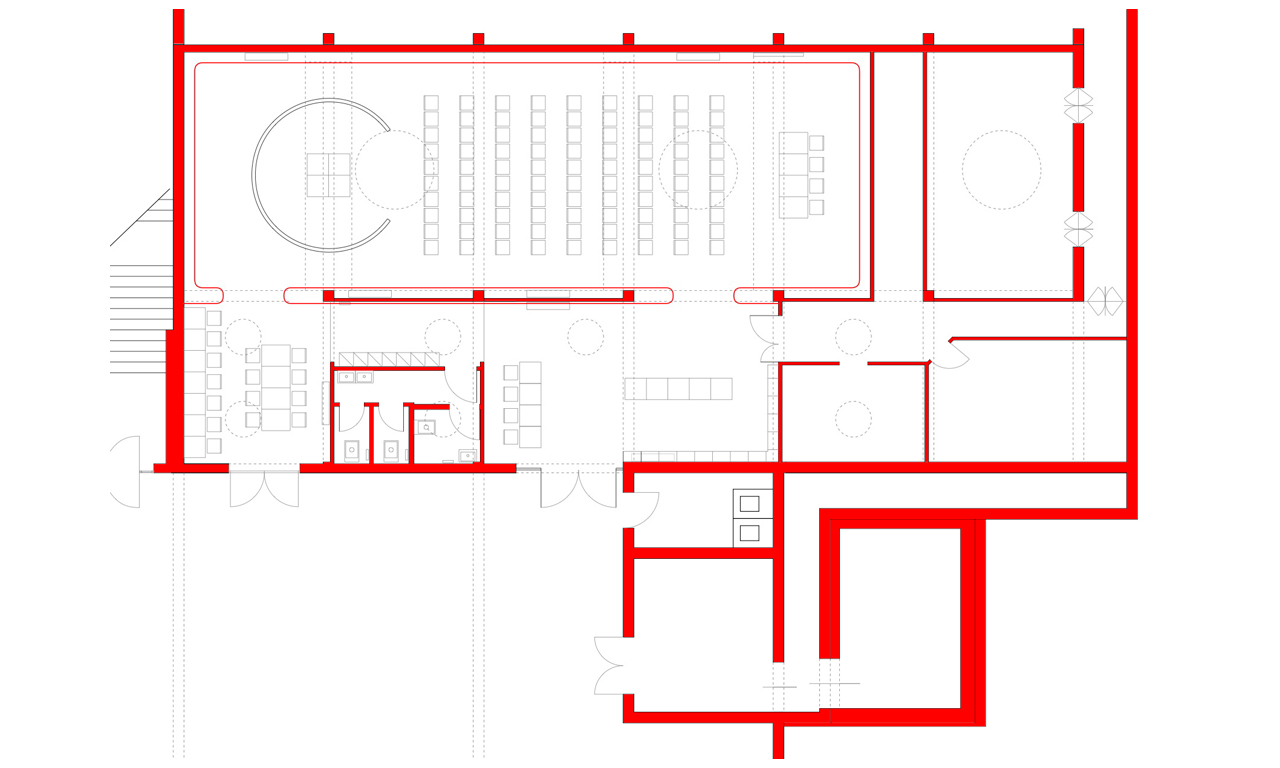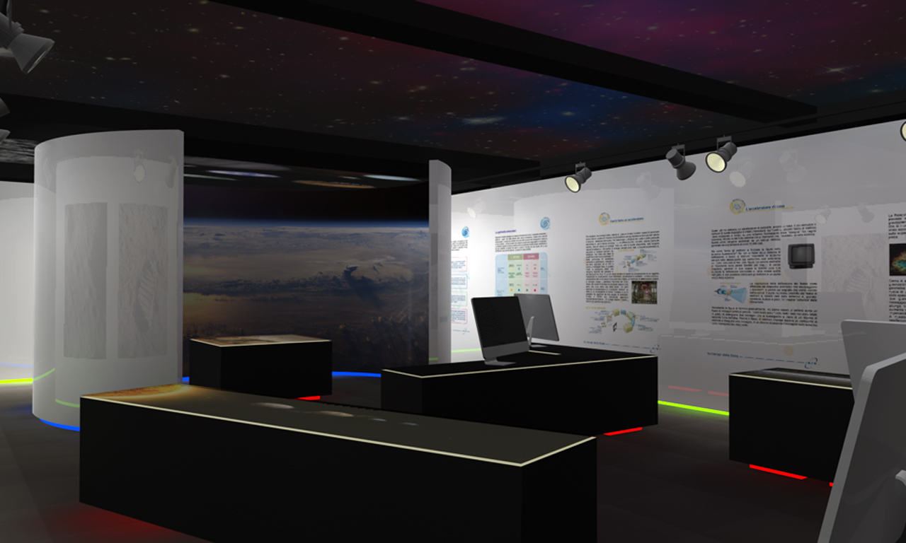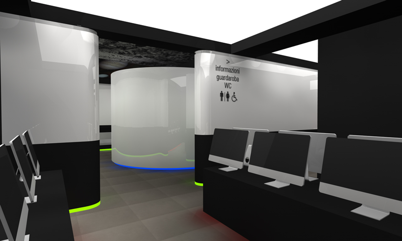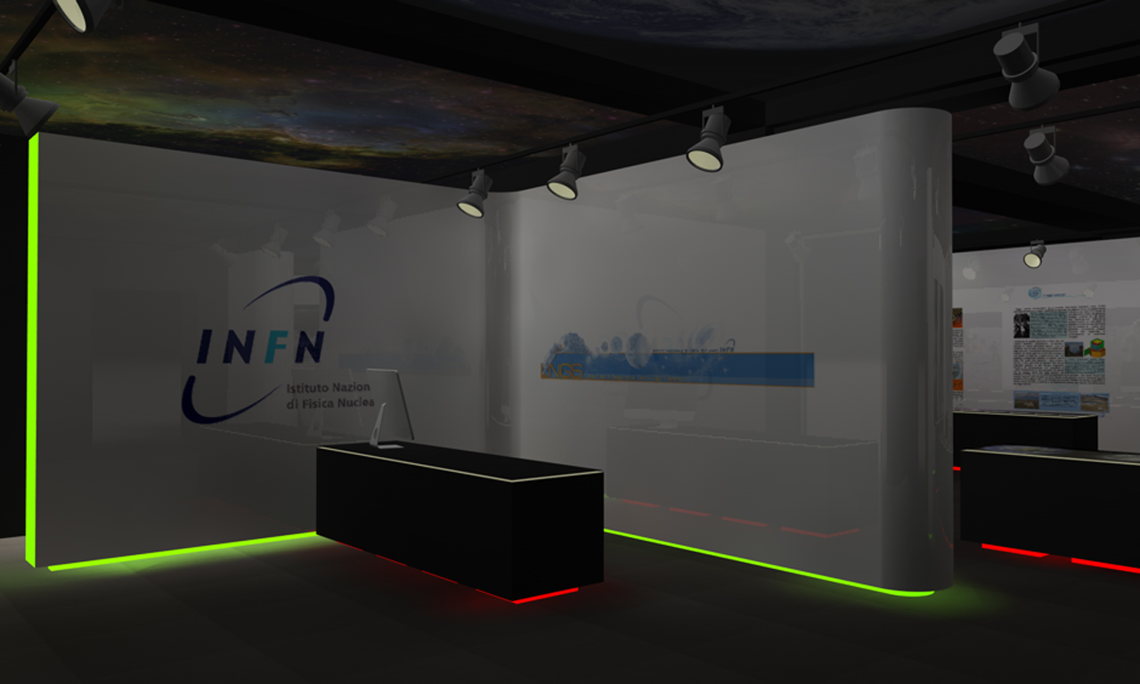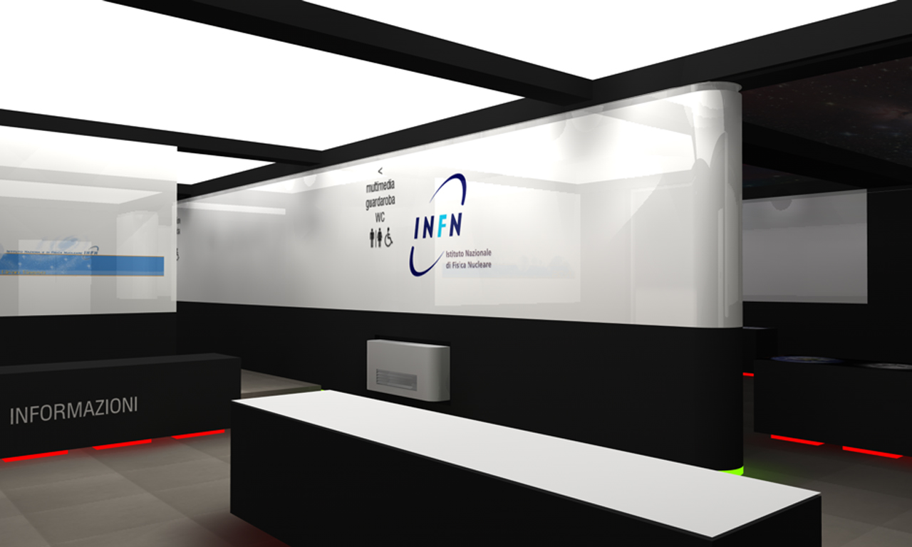 Il progetto per il Centro Visitatori del Laboratorio Nazionale del Gran Sasso - Istituto Nazionale di Fisica Nucleare propone la riqualificazione della "starting-zone" per i visitatori che si accingono ad effettuare il tour all’interno dei Laboratori di Fisica Nucleare. La necessità di effettuare le visite per microgruppi attraverso l’uso di veicoli, impone alla committenza di creare un punto di attesa per i visitatori che attendevano il proprio turno: è nata così l’idea di realizzare un Visitor’s Center all’interno del quale intrattenere gli ospiti con un percorso informativo caratterizzato prevalentemente dalla visione di contenuti multimediali. Oltre all’allestimento della reception in cui i visitatori vengono registrati, nella prima sala filtro, con accesso diretto alla piazzola minibus, è prevista un bookshop. La sala multimediale è caratterizzata da pareti per la visualizzazione di contenuti multimediali, da un Cave per la visione di filmati a 360°, da box touchscreen. Inoltre, l’utilizzo di teli retro-illuminati Barrisol per il soffitto aumenta la sensazione di vivere un viaggio nello spazio attraverso proiezioni tematiche.